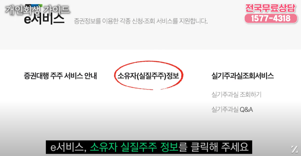 2) 'e서비스' 메뉴에서 '소유자(실질주주)정보'를 클릭합니다.