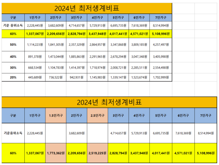 1. 2024년 1인 최저생계비 (外 2인, 3인, 4인, 5인 최저생계비)