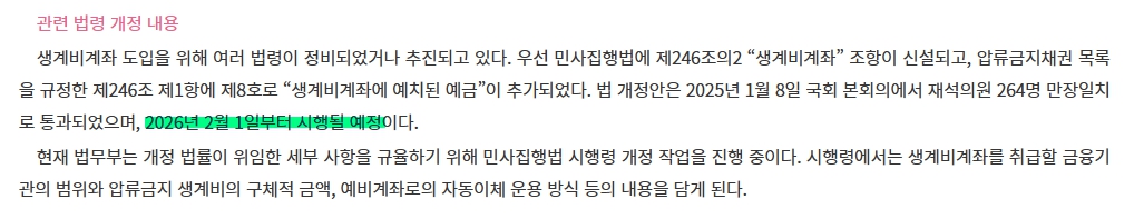 2025년 1월 8일 국회 본회의에서 생계비계좌 조항이 신설되었습니다.