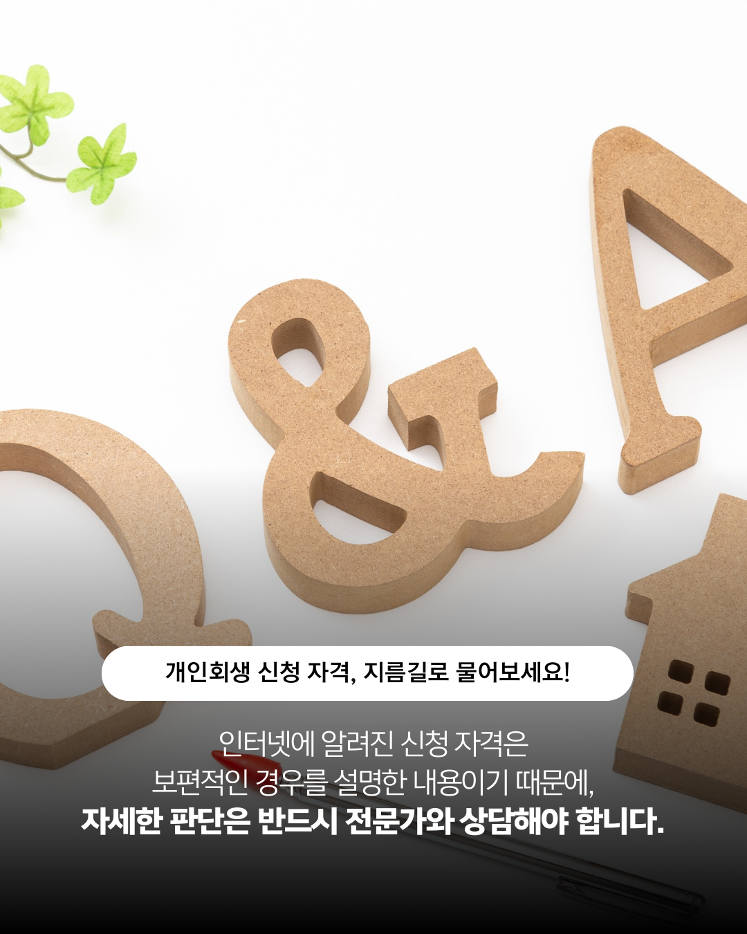 회생·파산 관련 상담 안내드립니다 지금 채무로 힘드신가요?혼자 끙끙 앓지 마시고,도산전문변호사의 상담을 받아보세요.✔ 개인회생, 개인파산, 법인파산 등✔ 자격 여부부터 진행 절차