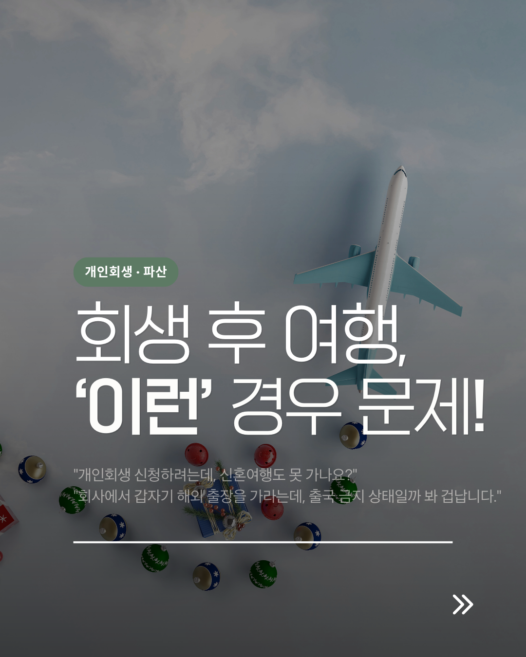 "변호사님, 저... 개인회생 신청하면 해외여행은 못 가는 건가요? 신혼여행인데..."