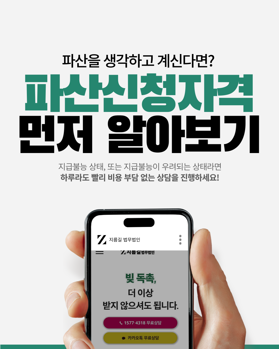 회생·파산 관련 상담 안내드립니다 지금 채무로 힘드신가요?혼자 끙끙 앓지 마시고,도산전문변호사의 상담을 받아보세요.✔ 개인회생, 개인파산, 법인파산 등✔ 자격 여부부터 진행 절차